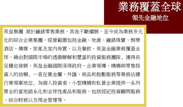 英皇金融集團屹立香港超過三十年,憑藉穩固根基、龐大網絡及專業團隊,深受客戶信任。英皇金融集團提供多元化交易渠道,包括傳統電話交易,以及24小時網上及智能手機交易平台。集團著重網上交易系統的安全性,透過嚴密監管,確保交易平台高效而穩定。英皇金融集團共有14間門市分行,遍佈港、九、新界,零售客戶基礎龐大。